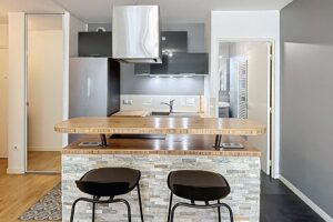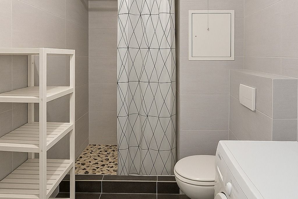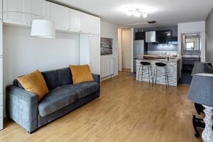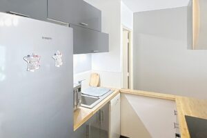 Il se compose d'une entrée avec placard intégré, d'une pièce de vie spacieuse avec cuisine américaine équipée (réfrigérateur, plaques, hotte, lave-vaisselle, micro-ondes) et d'une salle d’eau moderne avec douche, WC, machine à laver et sèche-serviette.